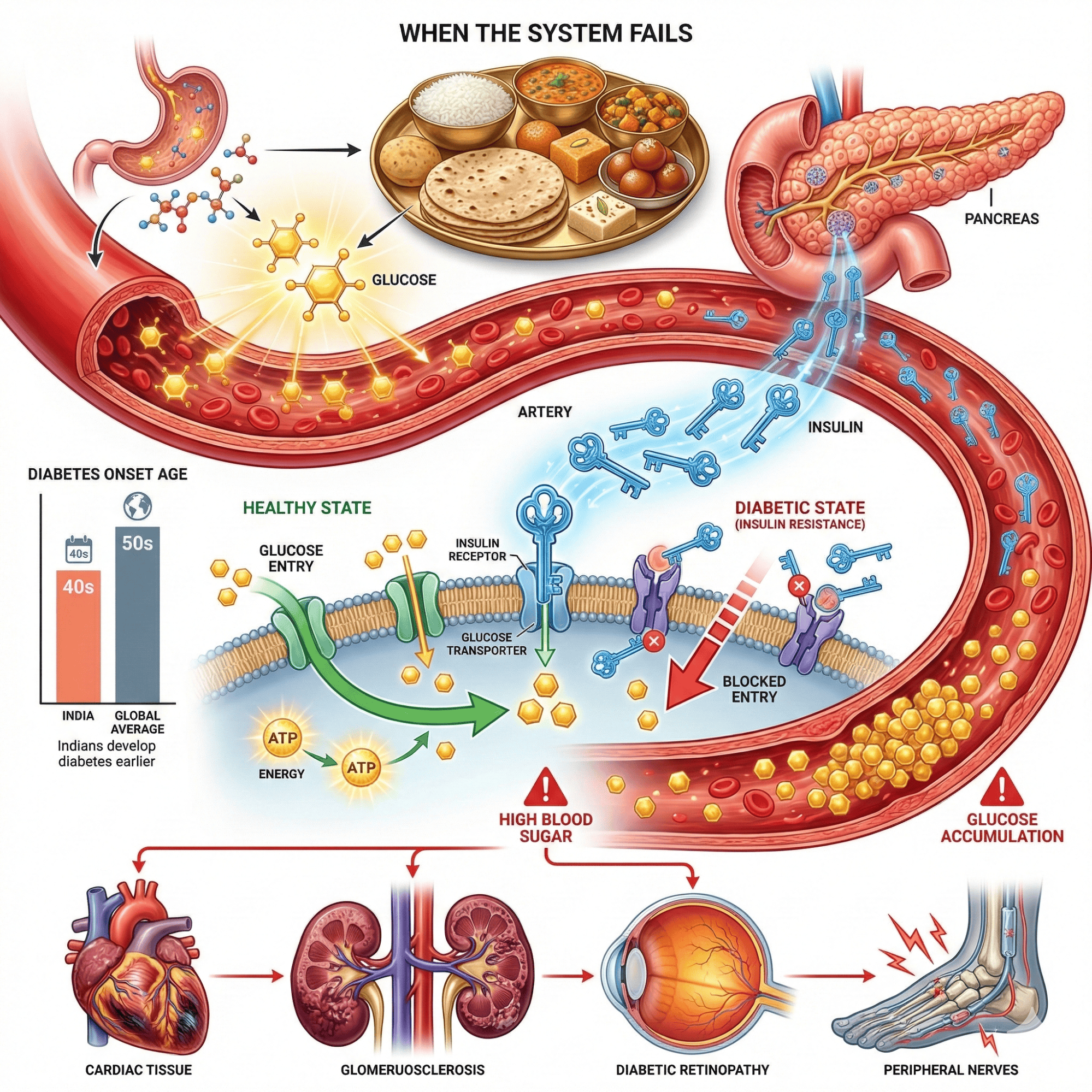 Studies on Indians reveal concerning trends in diabetes diagnosis patterns. Research shows that Indians develop diabetes at younger ages (40s instead of 50s) and at lower BMI levels compared to Westerners. One major study found that urban Indians had diabetes prevalence of 20% or higher in some cities. Additionally, Indians often have higher post-meal glucose spikes even when fasting glucose appears normal. HbA1c levels (3-month average glucose) tend to be higher in Indians with similar fasting glucose compared to other populations. In fact, complications like heart disease appear earlier in Indian diabetics. These factors make regular monitoring with appropriate age-based targets crucial.