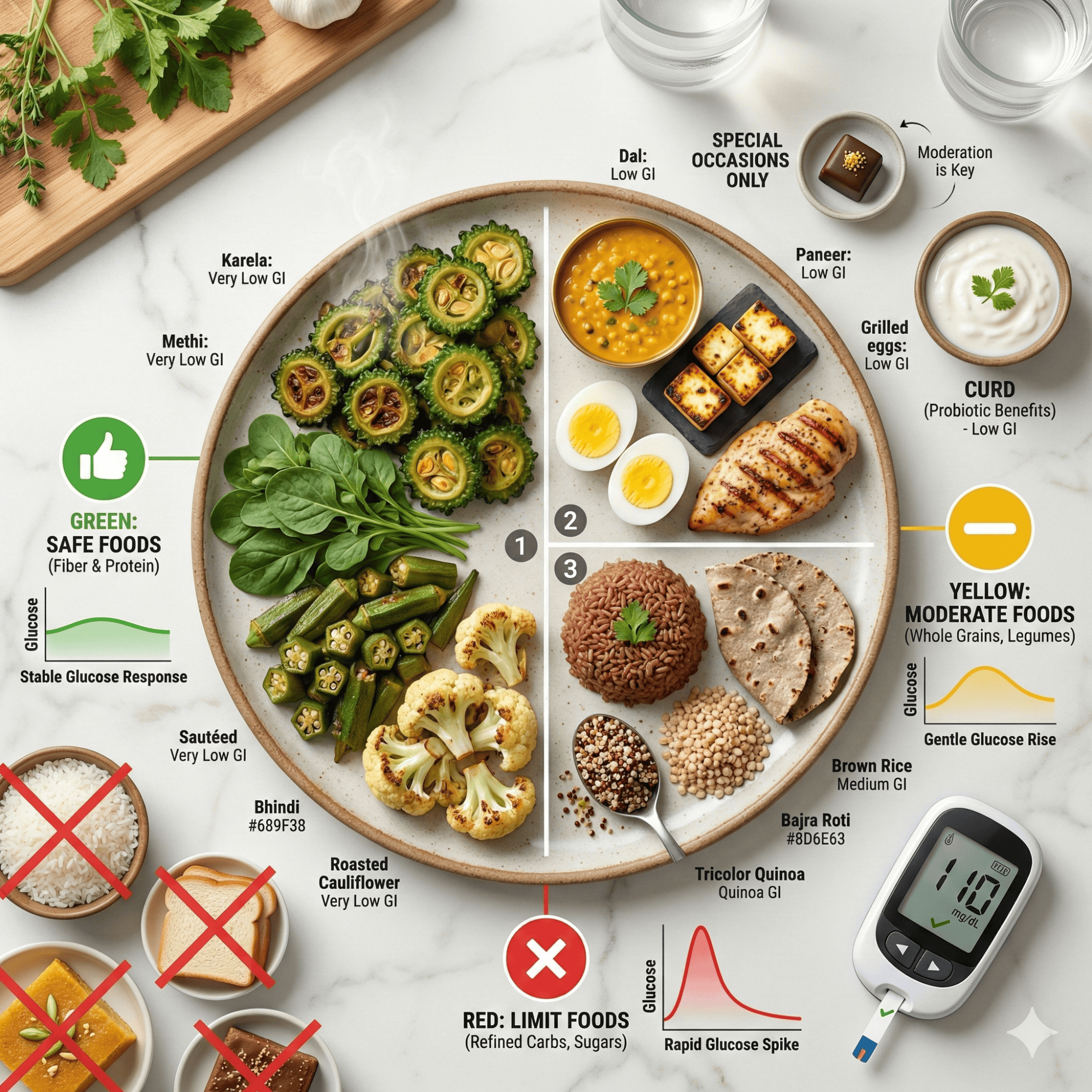 Eat whole dals, vegetables like karela and methi, whole grains (bajra, jowar, brown rice), curd, and lean proteins like eggs or chicken. These maintain healthy blood sugar ranges when eaten in proper portions with minimal refined carbs and sweets.