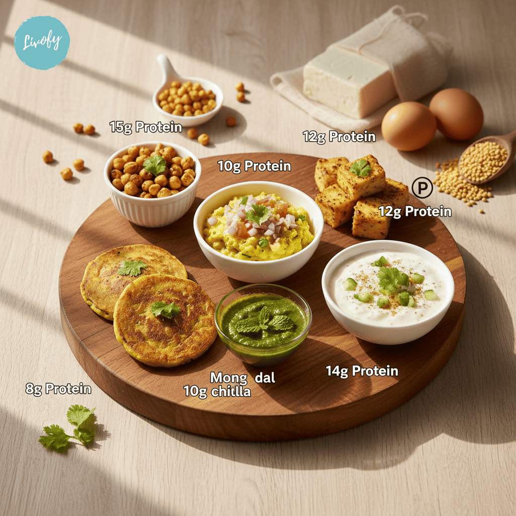 Sprouts Chaat (1/2 cup, 100 calories): Mixed sprouts with onions, tomatoes, lemon juice, and spices. Incredibly filling with complete plant protein.
