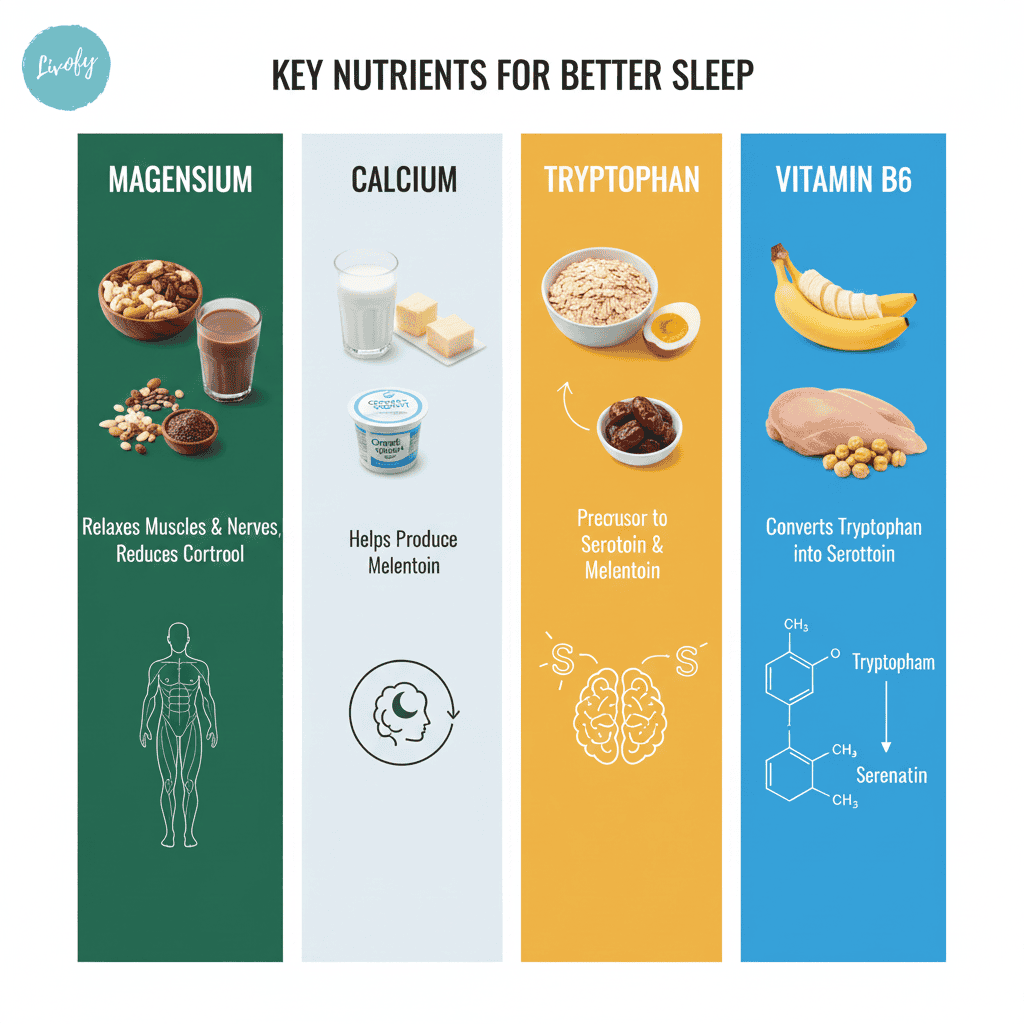 Magnesium (found in nuts and seeds) relaxes muscles and calms the nervous system. Calcium from dairy helps the brain use tryptophan to make melatonin.