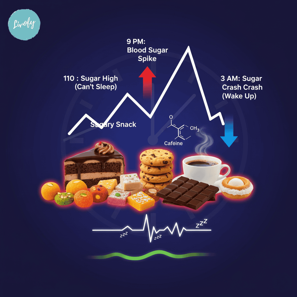 Sugary snacks cause rapid spikes and crashes. Your body might wake you up when glucose drops too low, completely disrupting your sleep cycle.