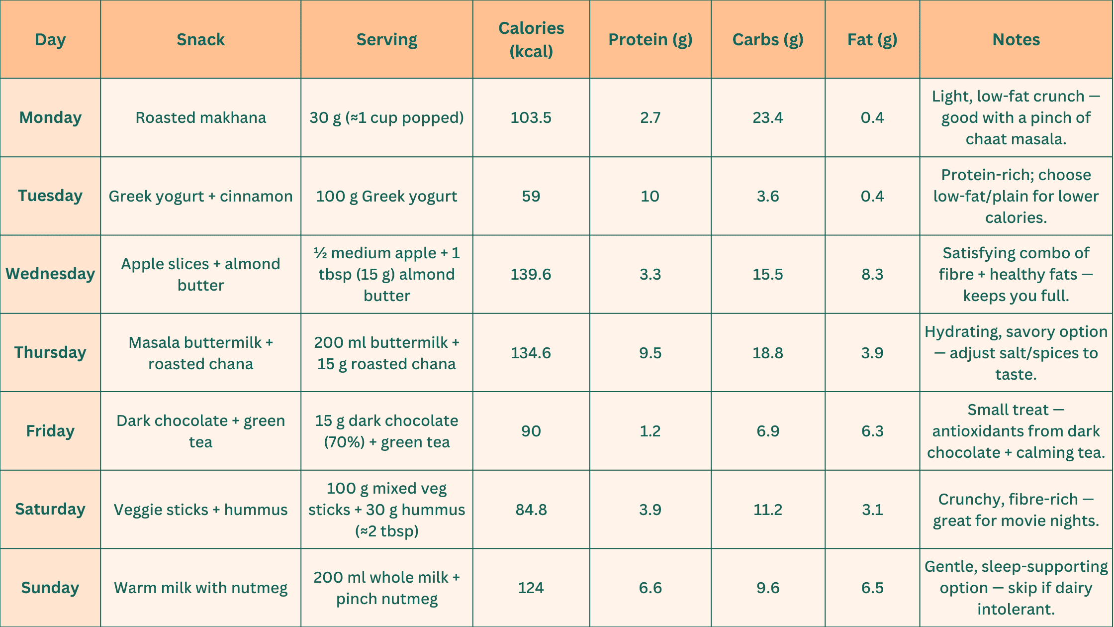 Makhana/Fox Nuts (1 cup roasted, 100 calories): Roast makhana with minimal oil, sprinkle with black salt and pepper. Crunchy like popcorn but way more nutritious.