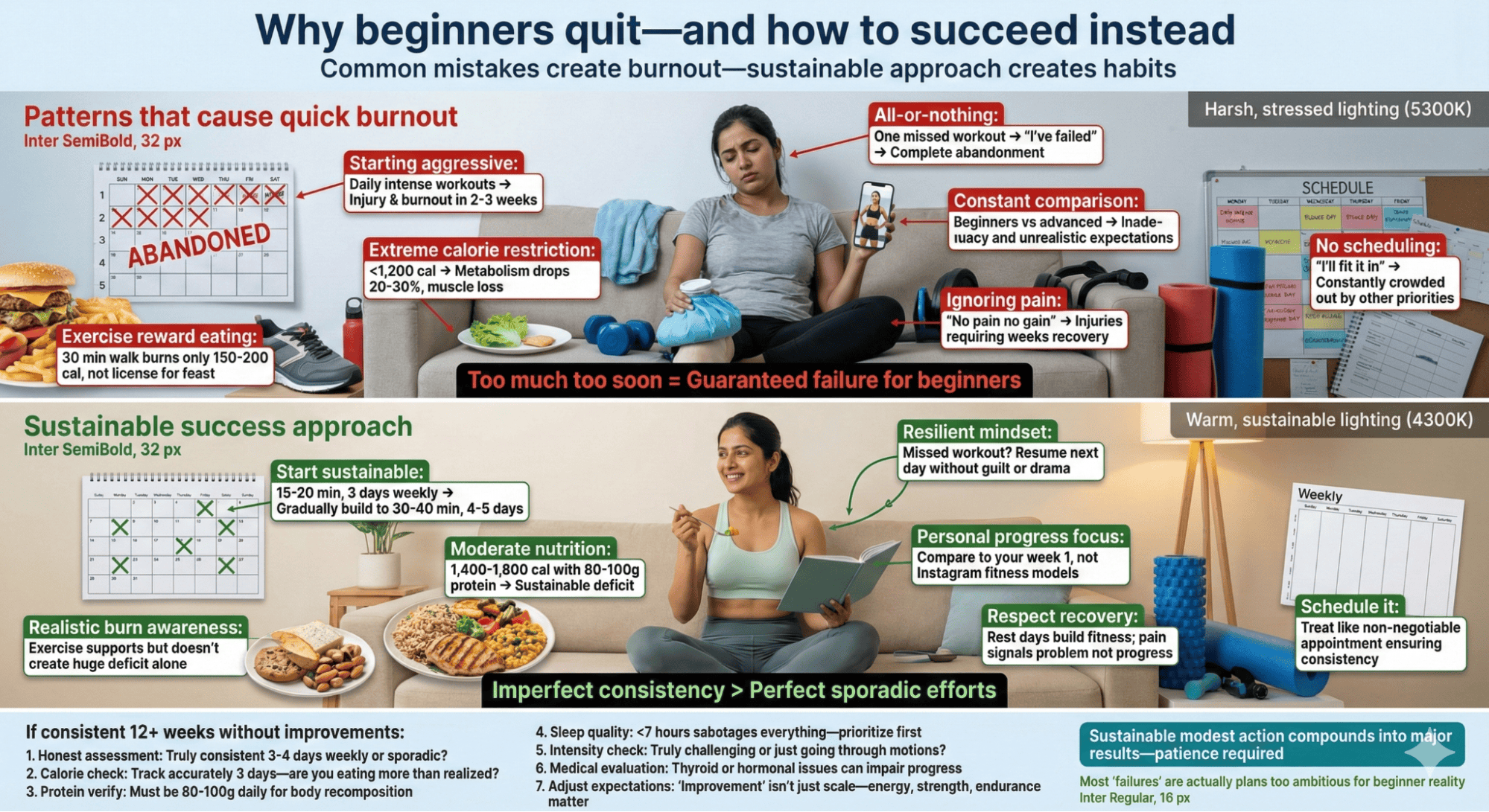 Starting too aggressively with daily intense workouts causes injury and burnout within weeks. Additionally, all-or-nothing thinking where one missed workout spirals into complete abandonment prevents building healthy habits. Moreover, constantly comparing yourself to advanced exercisers creates inadequacy and unrealistic expectations. Furthermore, not scheduling exercise means it gets crowded out constantly. Waiting for perfect conditions means perpetually delaying start. Additionally, exercising through pain causes injuries requiring weeks of recovery. Therefore, realistic expectations and sustainable pacing prevent pitfalls derailing beginner exercise.