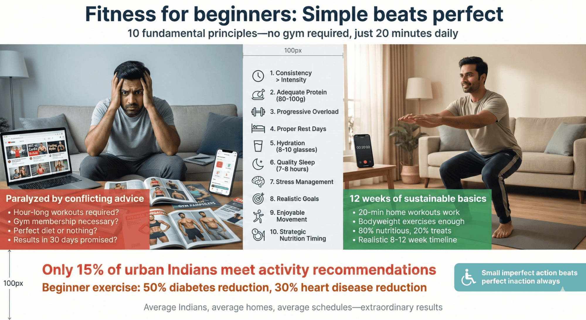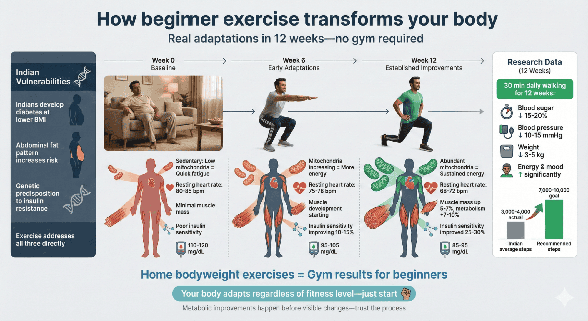 Research reveals only 15% of urban Indians meet activity recommendations. One study found Indians averaging 3,000-4,000 steps daily when 7,000-10,000 is ideal. Additionally, Indians beginning 30 minutes daily walking show significant improvements: blood sugar reduction 15-20%, blood pressure decrease 10-15mmHg, weight loss 3-5kg within 12 weeks. Moreover, home-based bodyweight exercises work as effectively as gyms for Indian beginner exercise goals. Therefore, accessible approaches produce measurable health improvements for our population.
