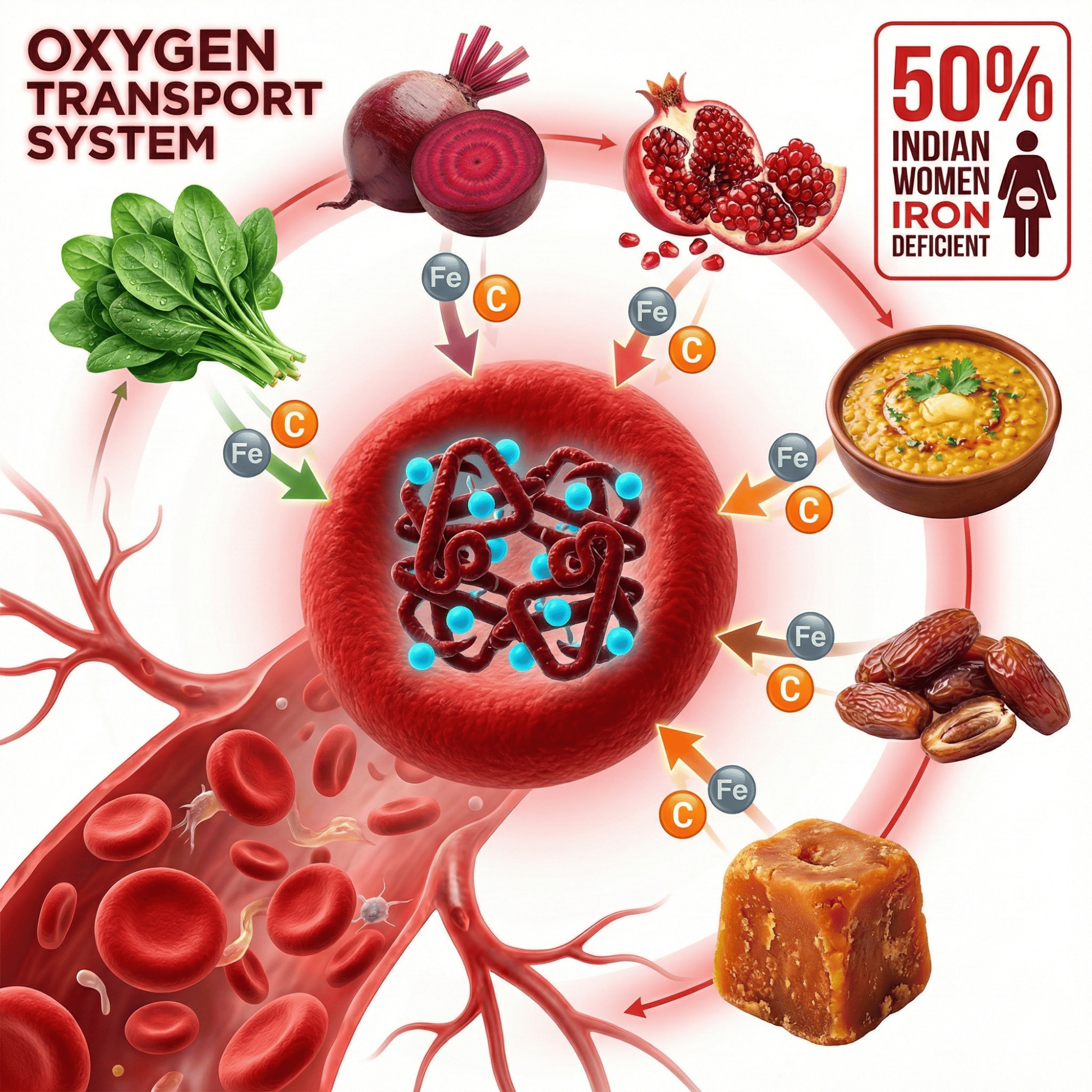 Foods to improve oxygen level are nutrients that support hemoglobin production and blood circulation, helping your blood carry oxygen efficiently to all cells. Indians face high rates of iron deficiency anemia (50% of women), making blood oxygen foods crucial for energy, immunity, and brain function.