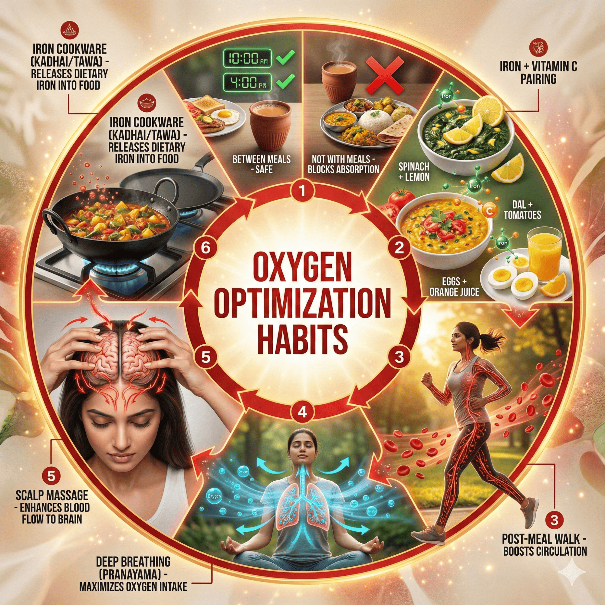 Indian cultural practices sometimes work against optimal oxygenation. Heavy menstrual bleeding, common in Indian women, depletes iron but is rarely discussed openly. Frequent fasting without proper nutrition afterward depletes reserves. Vegetarianism practiced without knowledge of iron absorption strategies causes deficiencies. Moreover, social norms mean women often eat last and least in families, getting inadequate nutrition. Tea culture means drinking chai with every meal, blocking iron absorption. Navigate these by breaking taboos around menstrual health and seeking help when needed. Plan fasts carefully with nutrient-dense breaking meals. Learn proper vegetarian nutrition. Communicate your health needs to family. Drink chai between meals instead.