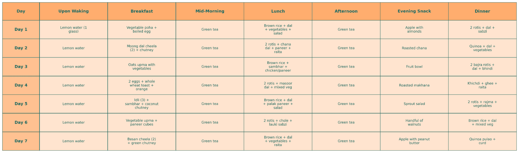 Note: Drink plain water between meals too (8 to 10 glasses total daily). Avoid green tea after 4 PM if caffeine sensitive.