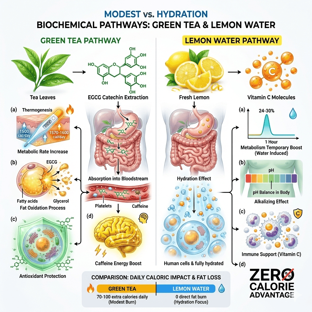 Green tea vs lemon water compares two popular drinks for weight loss. Green tea contains catechins and caffeine that may slightly boost metabolism, while lemon water provides hydration with vitamin C. Both are fat burning drinks primarily through replacing high-calorie beverages, not magical fat burning.