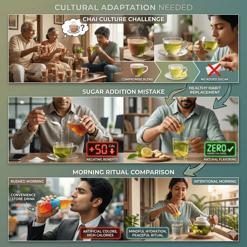 Traditional Indian tea (chai) culture complicates the green tea vs lemon water choice. Many Indians grew up with chai multiple times daily, making green tea feel strange or unsatisfying. Additionally, the tendency to add sugar to everything means people often sweeten green tea or lemon water, negating any calorie benefits. Moreover, drinking habits at restaurants and offices default to sodas or sweetened beverages. Solutions include gradually transitioning from chai to green tea by mixing them initially. Add lemon or ginger to green tea for flavor without calories. Choose herbal varieties if you’re sensitive to caffeine. Additionally, start meals with lemon water to stay hydrated and reduce calorie-dense beverage consumption. These small shifts support overall calorie reduction.