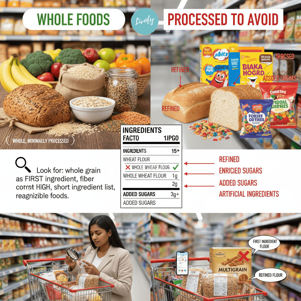 Prioritize unprocessed carbs from whole food sources and prefer brown rice over white. Whole wheat over refined flour and fresh fruit over fruit juice. Read labels carefully because many products marketed as “whole grain” contain mostly refined flour with minimal whole grains. Look for products where whole grains are the first ingredient. Always cook more at home, where you control ingredients, as this ensures genuine nutrition without hidden sugars or excessive processing.