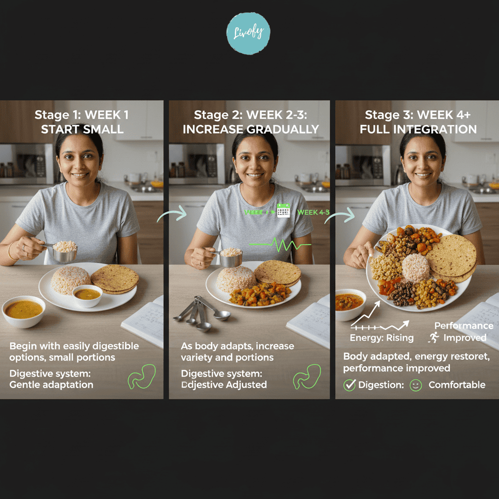 Begin with small portions of easily digestible carbs, like half a cup of cooked rice or one slice of whole-grain bread per meal, which allows your system to readjust. Choose simple preparations initially—plain rice, simple dal, basic oatmeal. These are good starting points.