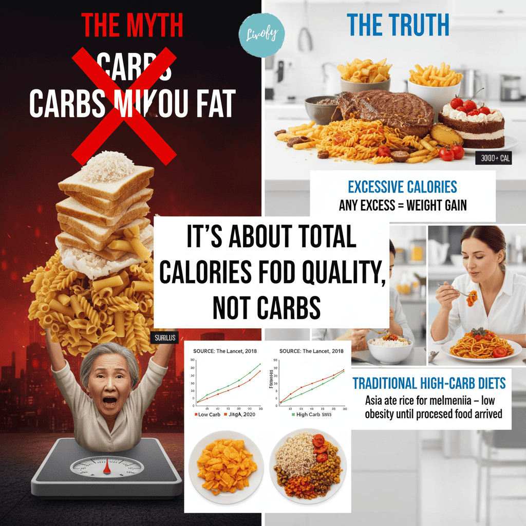 The fear around carbs is unnecessary, as science shows that the type of carbs you eat matters more than avoiding them completely. Healthy carbs from whole foods like whole grains, beans, fruits, and vegetables give you important fiber, vitamins, minerals, and steady energy. People eating traditional carb-rich diets have stayed healthy throughout history. Problems only started when processed, refined carbs became common.