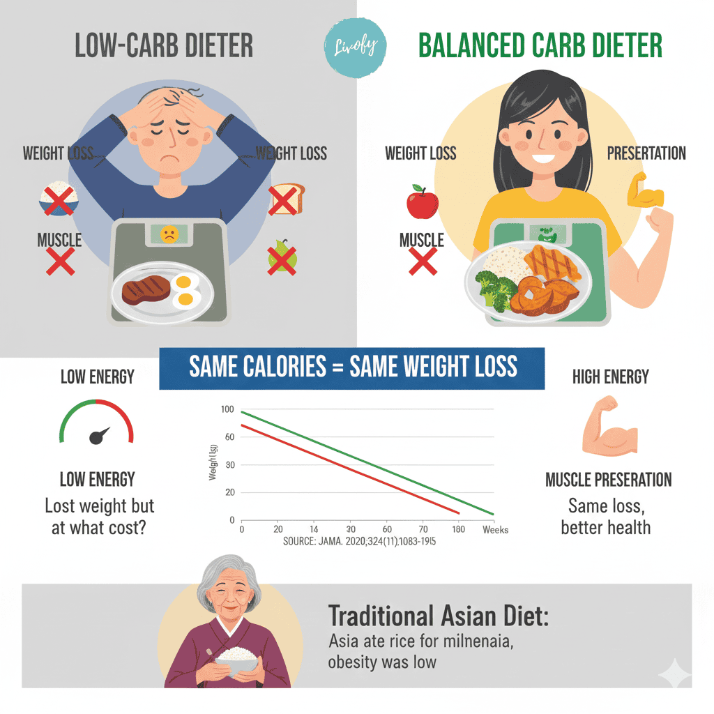 Despite what everyone claims, you don’t need to eliminate carbs to lose weight. The debate of low carb vs balanced carbs often misses the point entirely. Multiple studies comparing low-carb and balanced-carb diets with equal calories show similar weight loss results. Studies comparing these approaches with equal calories show that carbohydrate balance matters more than extreme restriction.
