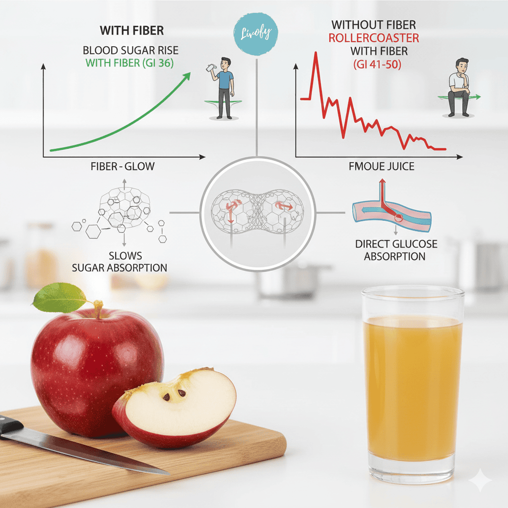 When you eat an apple (with fiber), your blood sugar rises slowly. Drink apple juice (without fiber), and it spikes rapidly. Same fruit. Completely different metabolic effect.