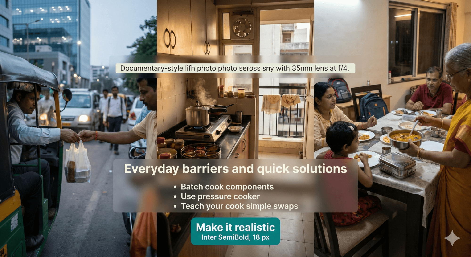 This meal plan demonstrates healthy Indian cooking with practical hacks: