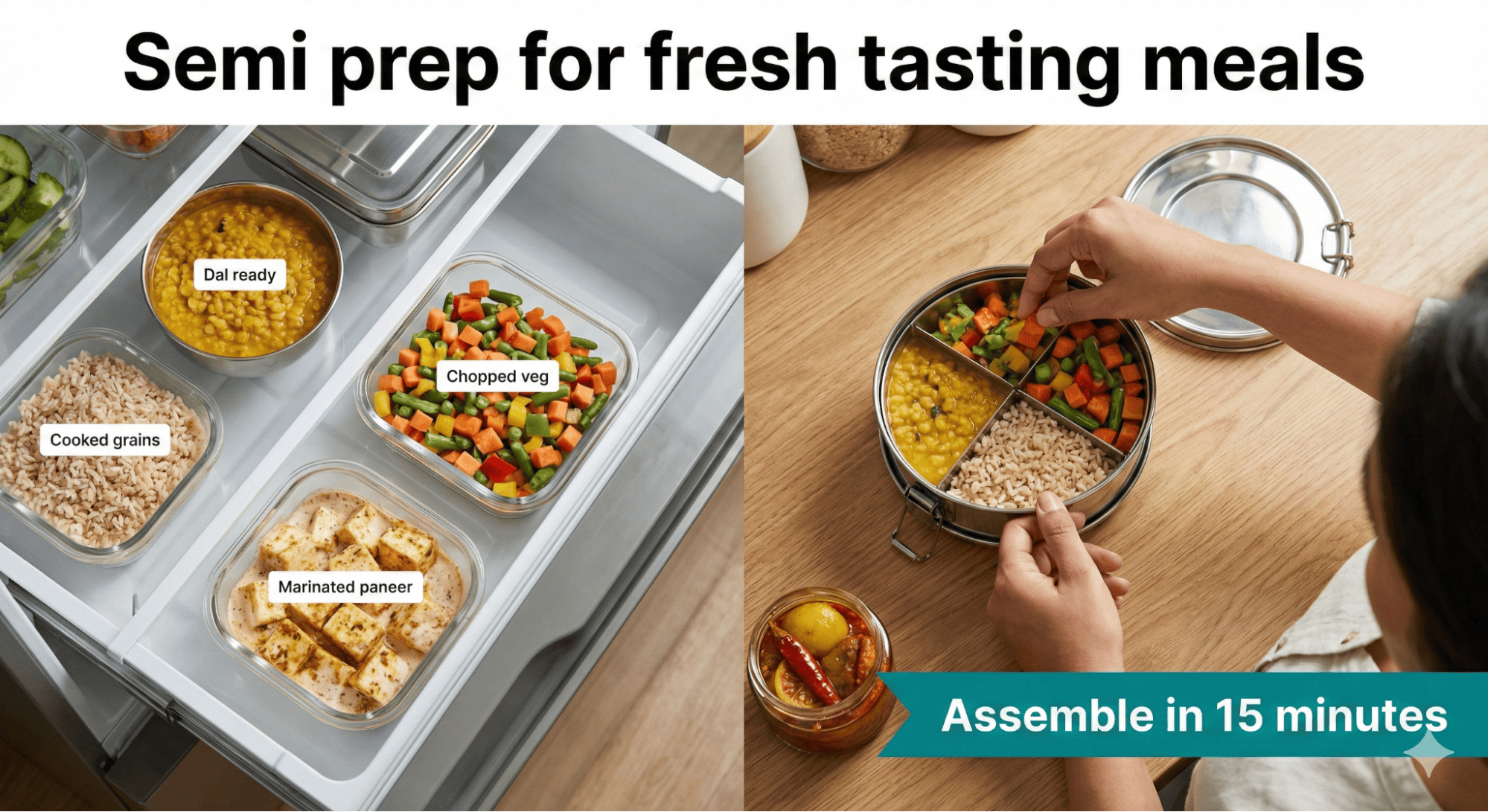 Indian meal prep differs from Western meal prep in accommodating fresh Indian cooking preferences. Rather than full meal prep, prepare components for quick assembly. On weekends, cook 2 to 3 types of dal storing portions. Additionally, pre-chop vegetables storing in containers or bags for 2 to 3 days use. Boil eggs, marinate paneer or chicken. Moreover, cook grains like rice, quinoa storing portions. Make roti dough storing in fridge for quick rolling and cooking. Furthermore, prepare spice mixes, chutneys, and tadkas in advance. During weekdays, quickly assemble pre-prepped components into fresh meals taking 15 to 20 minutes. This semi-prep approach maintains fresh taste Indians prefer while reducing daily cooking burden. In fact, even minimal prep like pre-chopping vegetables saves significant time encouraging consistent home cooking. Therefore, find prep level sustainable for you rather than attempting elaborate systems you’ll abandon.