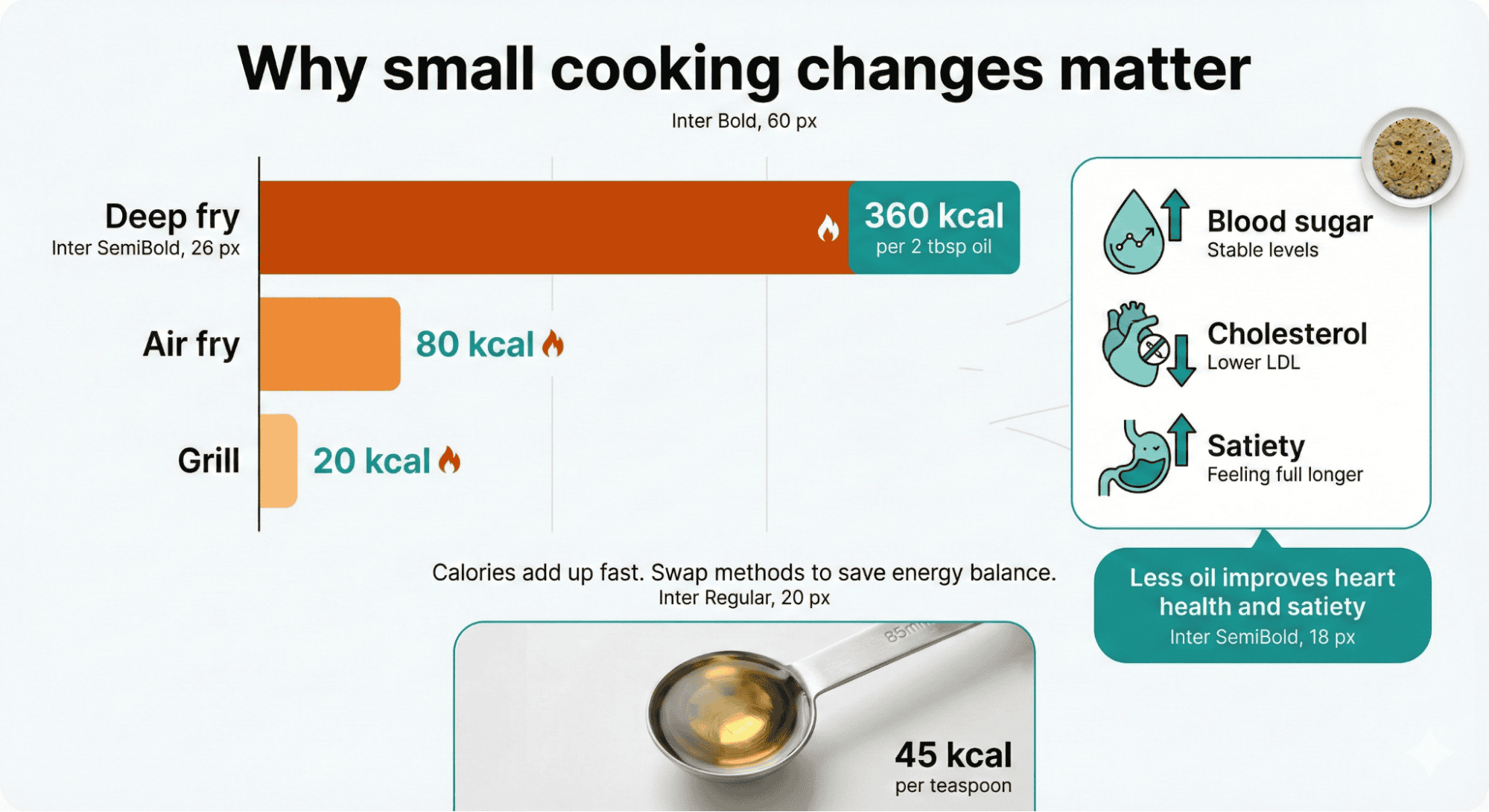 Healthy Indian cooking affects your health through reducing calorie density while maintaining nutrients and satisfaction. Excess oil adds 9 calories per gram without nutrients or satiety. Therefore, using 2 tablespoons instead of 6 in a sabzi saves 360 calories affecting weight significantly over time. Additionally, reducing salt prevents water retention and hypertension common in Indians. Moreover, ingredient substitutes like whole wheat for refined flour increases fiber, stabilizing blood sugar and improving satiety. Furthermore, cooking methods matter. Grilling, baking, or air frying versus deep frying dramatically reduces calories and unhealthy fats. In fact, the same foods prepared differently create different metabolic effects. Palak paneer with minimal oil versus restaurant preparation swimming in cream affects your body completely differently despite being “the same dish.” Understanding these mechanisms helps you prioritize which Indian kitchen hacks matter most.