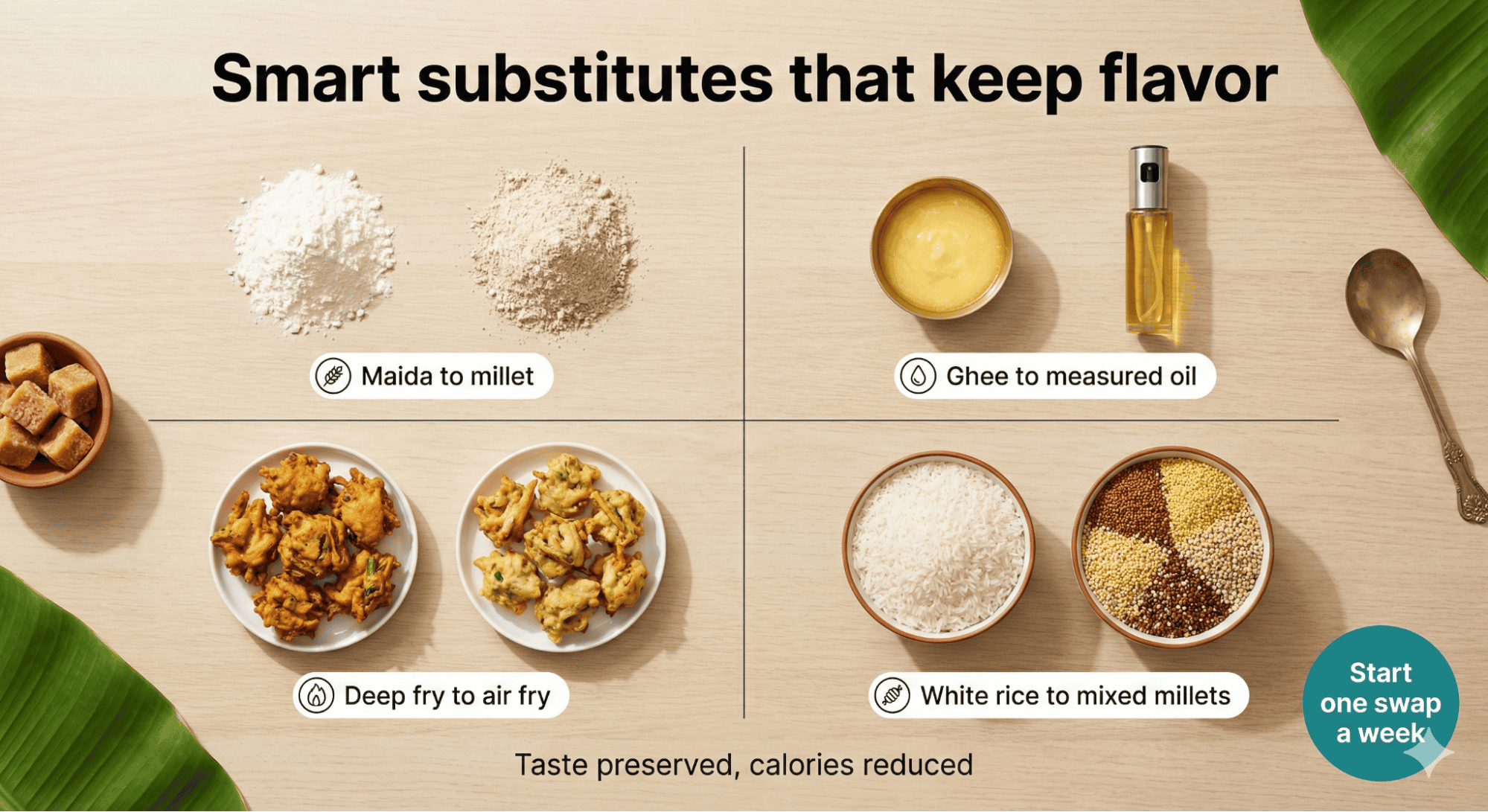 Modifications include measuring oil (1 to 2 tsp per dish instead of pouring freely), using non-stick pans, steaming or pressure cooking, air-frying or oven-roasting instead of deep frying, and maximizing spices and herbs for flavor. Traditional cooking methods like tempering with minimal oil, dry roasting spices, and fermenting maintain flavor with less fat.