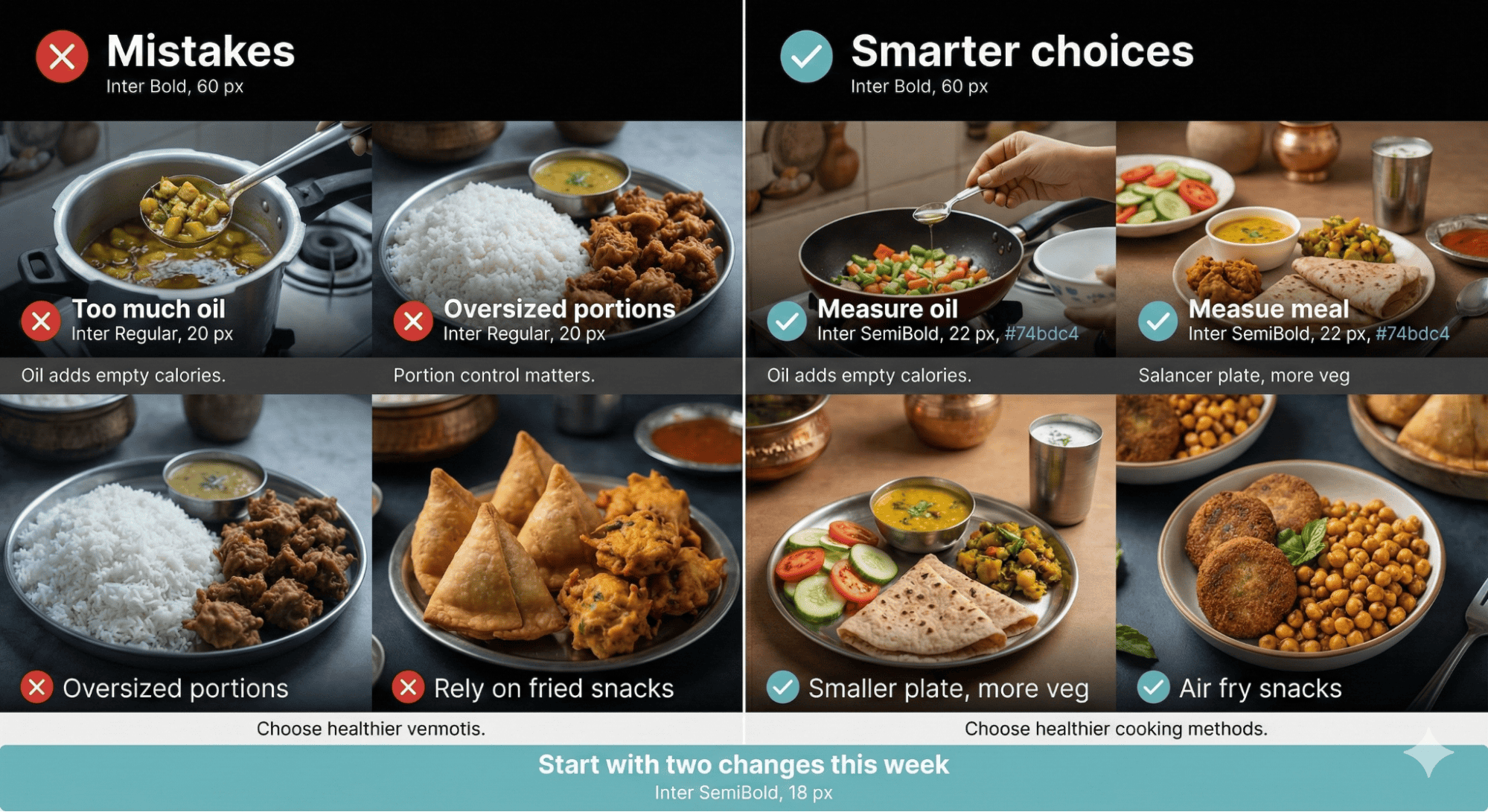 Start this week by implementing one Indian kitchen hack: measure your cooking oil. Most Indians use 3 to 4 times the needed amount without realizing it. Additionally, add an extra vegetable to one meal daily. These two changes alone significantly improve nutrition.