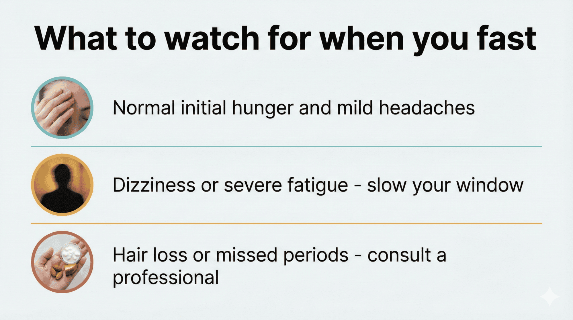 Common initial symptoms include hunger pangs, headaches, irritability, and fatigue during the first week as your body adapts to new eating patterns consistently. Warning signs to watch include hair loss, irregular periods in women, persistent dizziness, binge eating during eating windows, or developing an unhealthy obsession with food and fasting schedules.