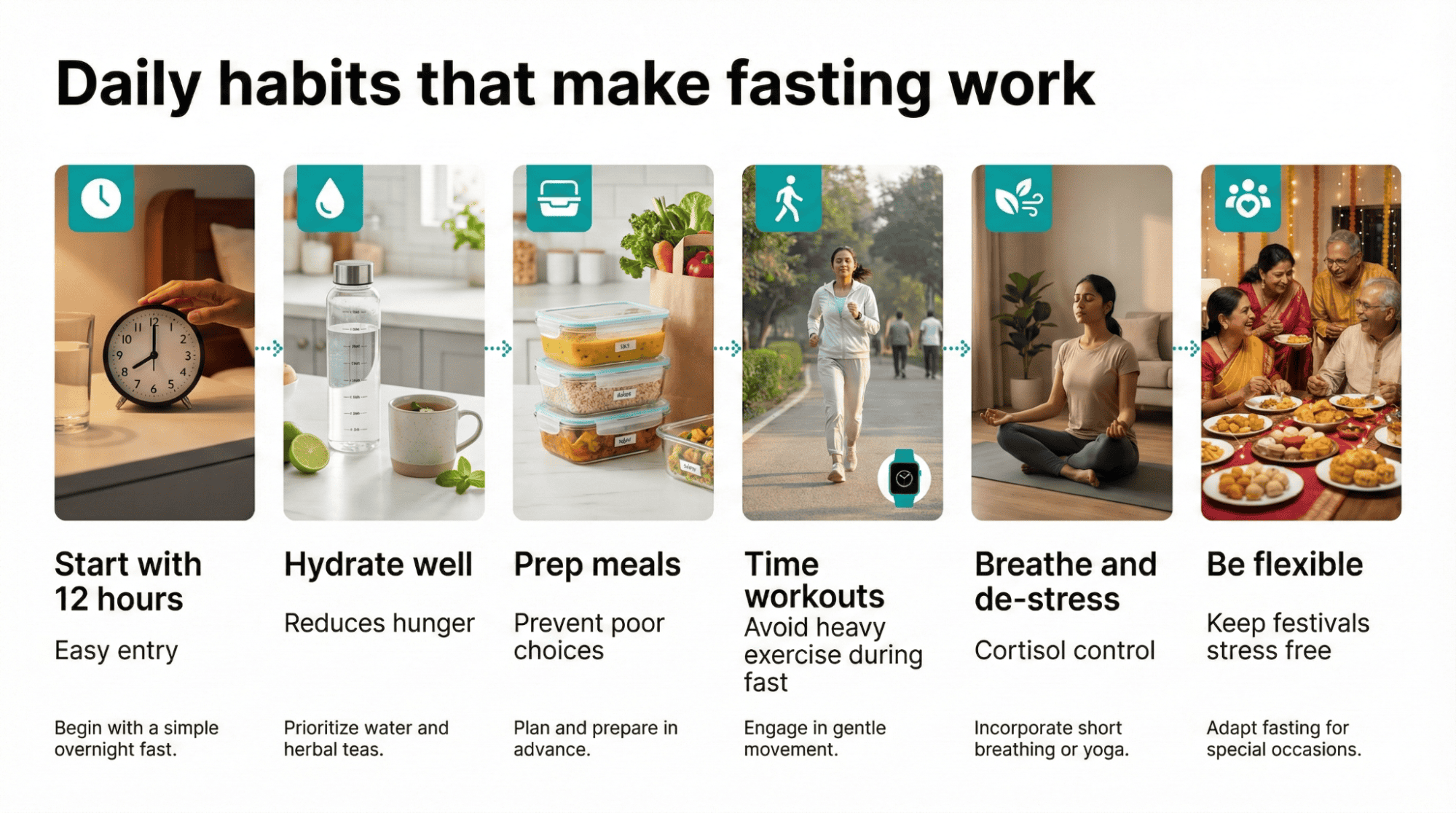 Start with twelve-hour overnight fasts from eight PM to eight AM, which most people can manage without significant hunger or lifestyle disruption. Gradually extend fasting windows by thirty minutes weekly until reaching fourteen to sixteen hours if comfortable rather than jumping immediately to strict schedules. Choose eating windows that accommodate your family’s meal times, such as twelve PM to eight PM if dinners happen later in evenings. Allow flexibility for special occasions and festivals rather than maintaining rigid fasting schedules that create social isolation or family tension unnecessarily.