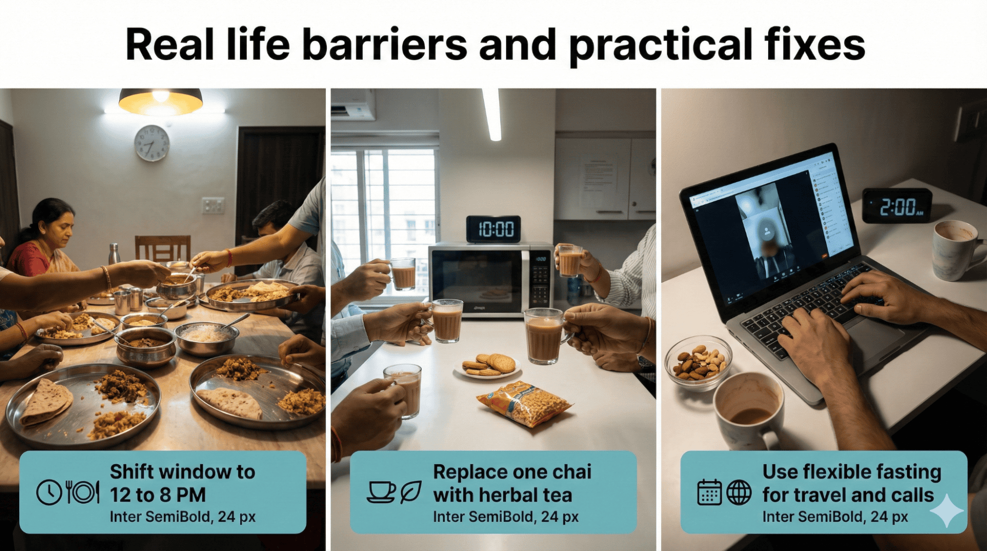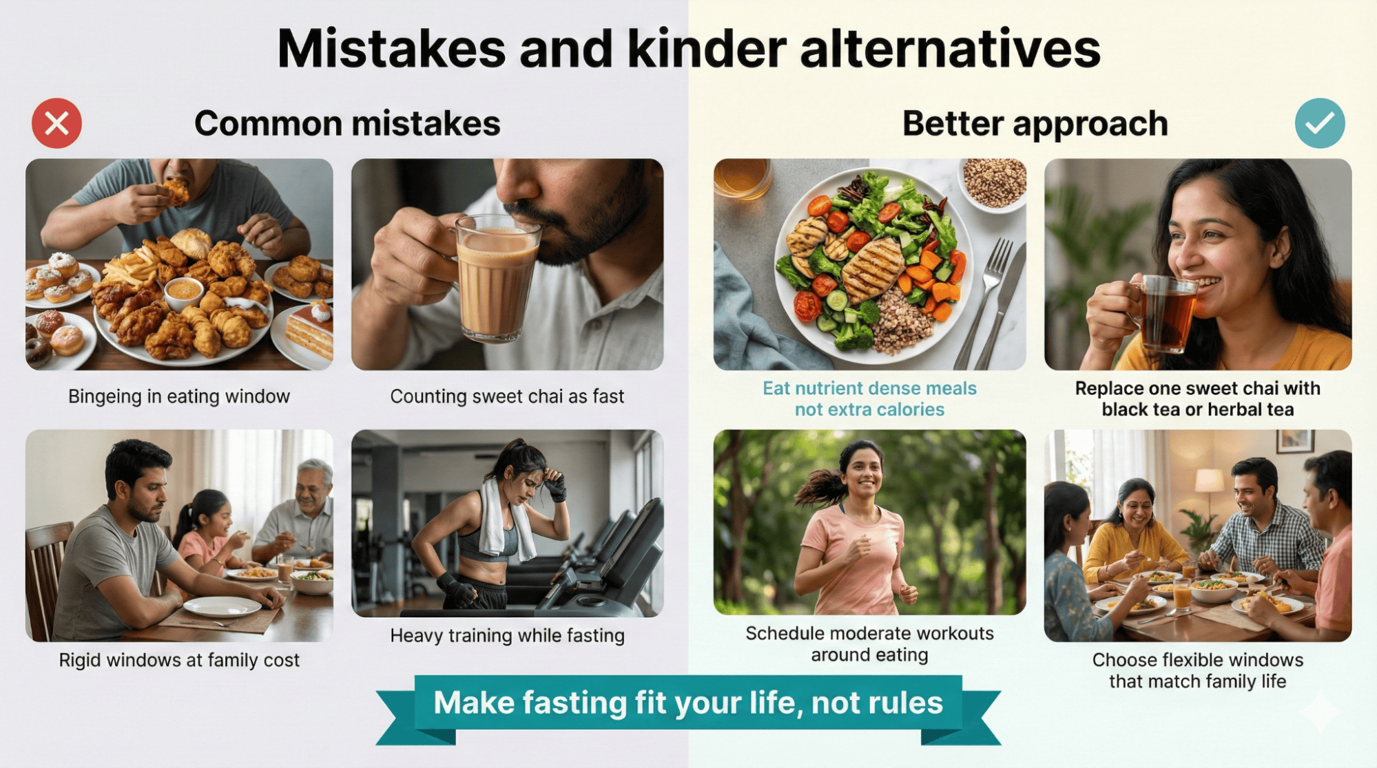 Family dinners happening at nine or ten PM make standard sixteen-eight fasting windows impractical for most Indian households with traditional schedules. Morning chai rituals feel essential for starting your day, yet adding milk and sugar technically breaks your fast before eating windows begin. Social gatherings and festivals centered around food at all hours create pressure to break fasts early or extend eating windows unnecessarily. Adapting fasting to your actual life means choosing eating windows that accommodate family meals rather than isolating yourself during traditional times.