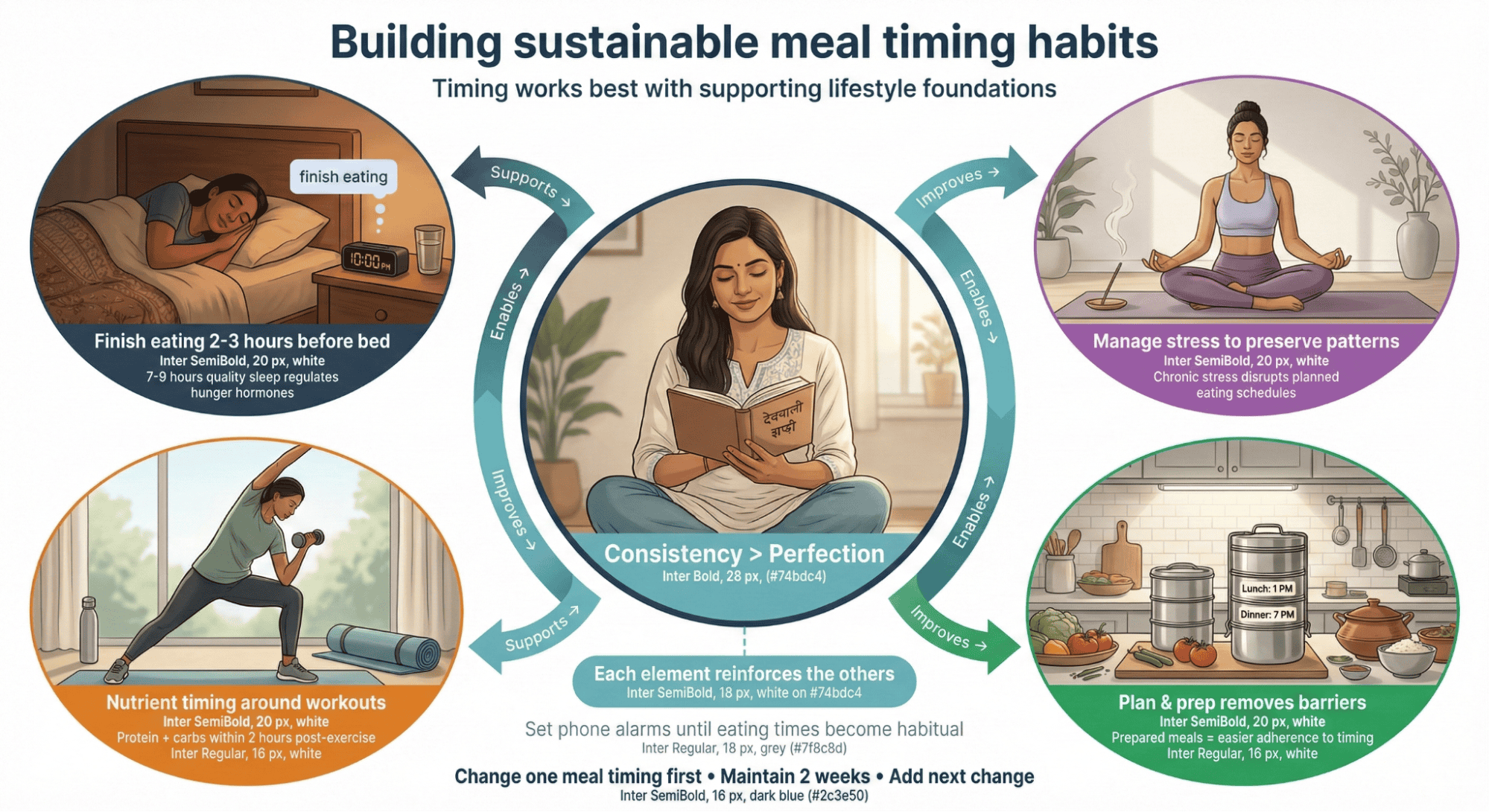 Indians need practical meal timing guidance because traditional eating patterns are changing rapidly. Urban Indians eat later dinners due to work schedules, skip breakfasts rushing to office, and snack constantly on packaged foods. Additionally, cultural celebrations and social gatherings happen late evening, conflicting with recommendations for early dinners. Moreover, family dynamics mean cooking for others while managing your own eating schedule differently. Furthermore, Indians have genetic predisposition to insulin resistance making nutrient timing particularly relevant for blood sugar management. In fact, understanding science behind meal timing weight loss helps you make informed decisions about which timing “rules” actually matter versus which are flexible based on your lifestyle. Therefore, practical evidence-based guidance beats rigid rules that don’t fit Indian reality.