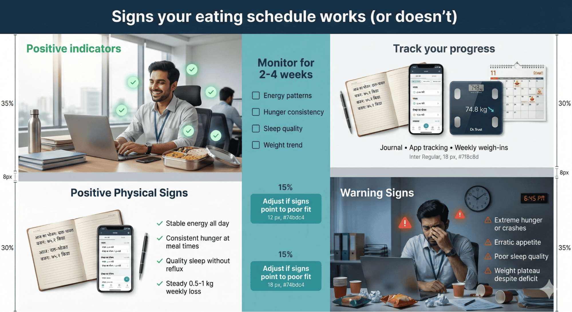 Your eating schedule affects observable physical markers you can track. Stable energy throughout the day without extreme afternoon crashes indicates good meal timing and food quality. Additionally, consistent hunger cues at predictable times signal well-regulated appetite hormones. Moreover, steady weight loss of 0.5-1 kilo weekly when in calorie deficit shows effective approach. Good sleep quality without nighttime waking or reflux suggests appropriate dinner timing. Furthermore, workout performance maintained or improving indicates adequate nutrient timing around exercise. Watch for these positive signs. Conversely, extreme hunger, energy crashes, poor sleep, or weight plateaus despite calorie deficit suggest timing adjustments might help. Therefore, tracking how you feel alongside scale weight provides comprehensive feedback about whether your current eating schedule suits your body and lifestyle.