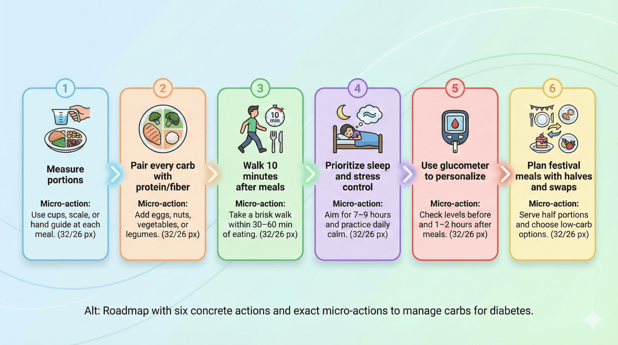 Start this week by measuring your current grain portions discovering actual consumption versus assumed amounts. Additionally, switch to brown rice or whole wheat rotis when possible for fiber benefit. Pair every carb-containing meal with protein and vegetables reducing glycemic impact by 30-40%.