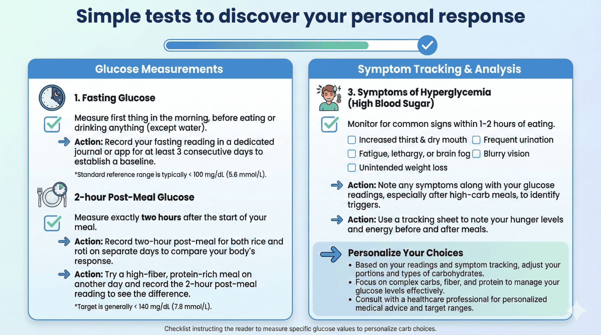 Glycemic index comparison effectiveness shows through blood sugar patterns and diabetes symptoms. Monitor fasting blood sugar staying below 100 mg/dL and post-meal readings below 140 mg/dL indicating good control. Additionally, HbA1c below 6.5% shows excellent 3-month average control from appropriate carbs for diabetics. Moreover, steady energy without mid-afternoon crashes suggests stable blood sugar from balanced meals. Furthermore, reduced thirst, frequent urination, and blurred vision indicate improving control. Watch for hypoglycemia symptoms including shakiness, sweating, or confusion suggesting overcorrection requiring adjustment. Therefore, multiple markers validate rice vs roti for diabetics strategy effectiveness.