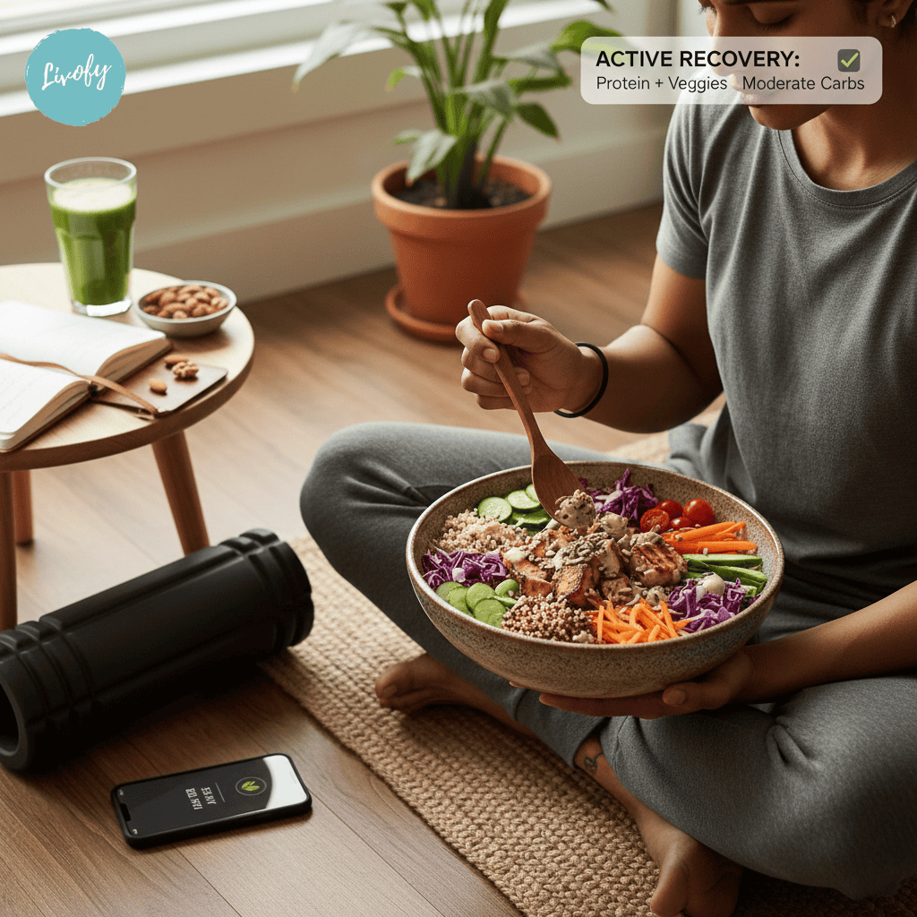 On light activity days, you need slightly less energy but still require protein for repair. Focus on protein and veggies with moderate carbs. Grilled paneer salad with quinoa. Dal soup with vegetables. Egg curry with one roti.