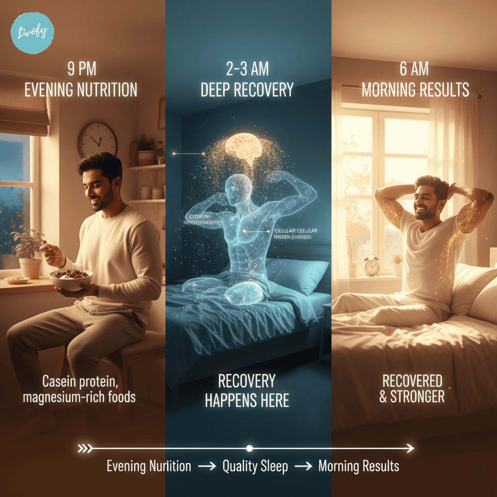 Have your last large meal 2-3 hours before bed. If you need a bedtime snack, choose casein-rich foods like cottage cheese or Greek yogurt. These provide slow-releasing protein throughout the night.