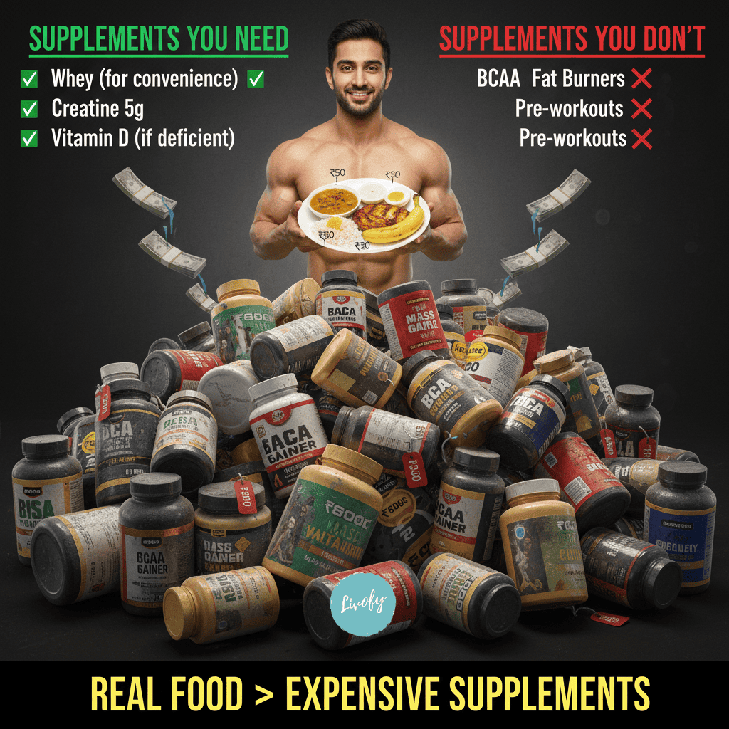 The basics that might actually help: whey protein for convenience, creatine for strength (it’s cheap too), vitamin D if you’re deficient, maybe omega-3s if you don’t eat fish.