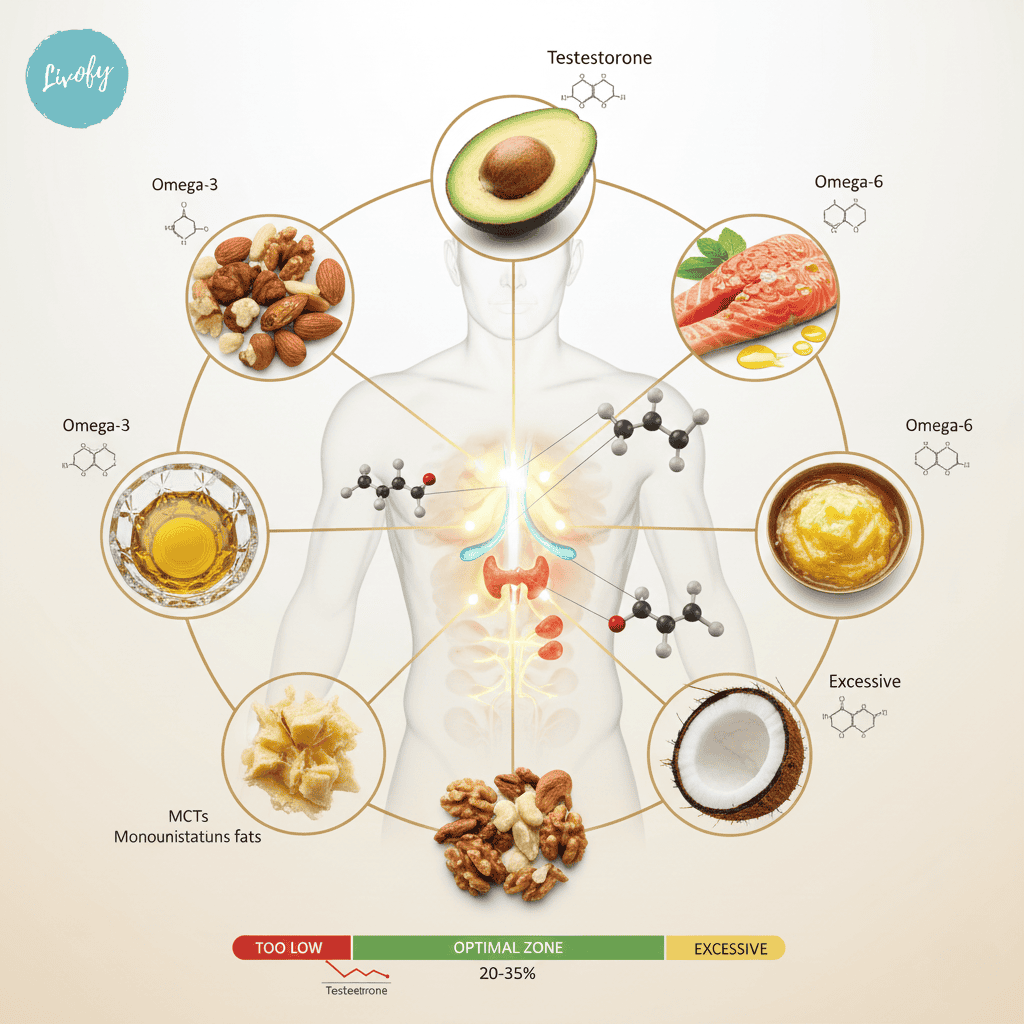 Don’t fear fats, seriously, because dietary fat is crucial for hormone production, including testosterone. Aim for 20-35% of your calories from healthy fats.