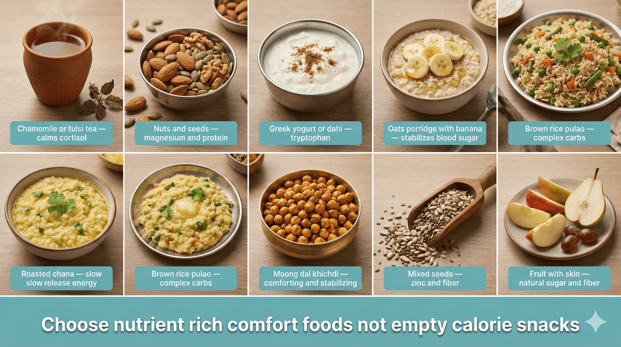 Eat your planned evening snack between four and five PM before stress peaks and decision-making becomes impaired by cortisol elevation. Roasted chana with cucumber and lemon offers crunchy satisfaction that gives your hands something to do during stressful moments at home. Apple slices with peanut butter provide a sweet and salty combination that satisfies cravings while delivering actual nutrition supporting stress management naturally. Additionally, herbal tea with a small handful of nuts gives you ritual and nourishment without triggering emotional eating patterns effectively.