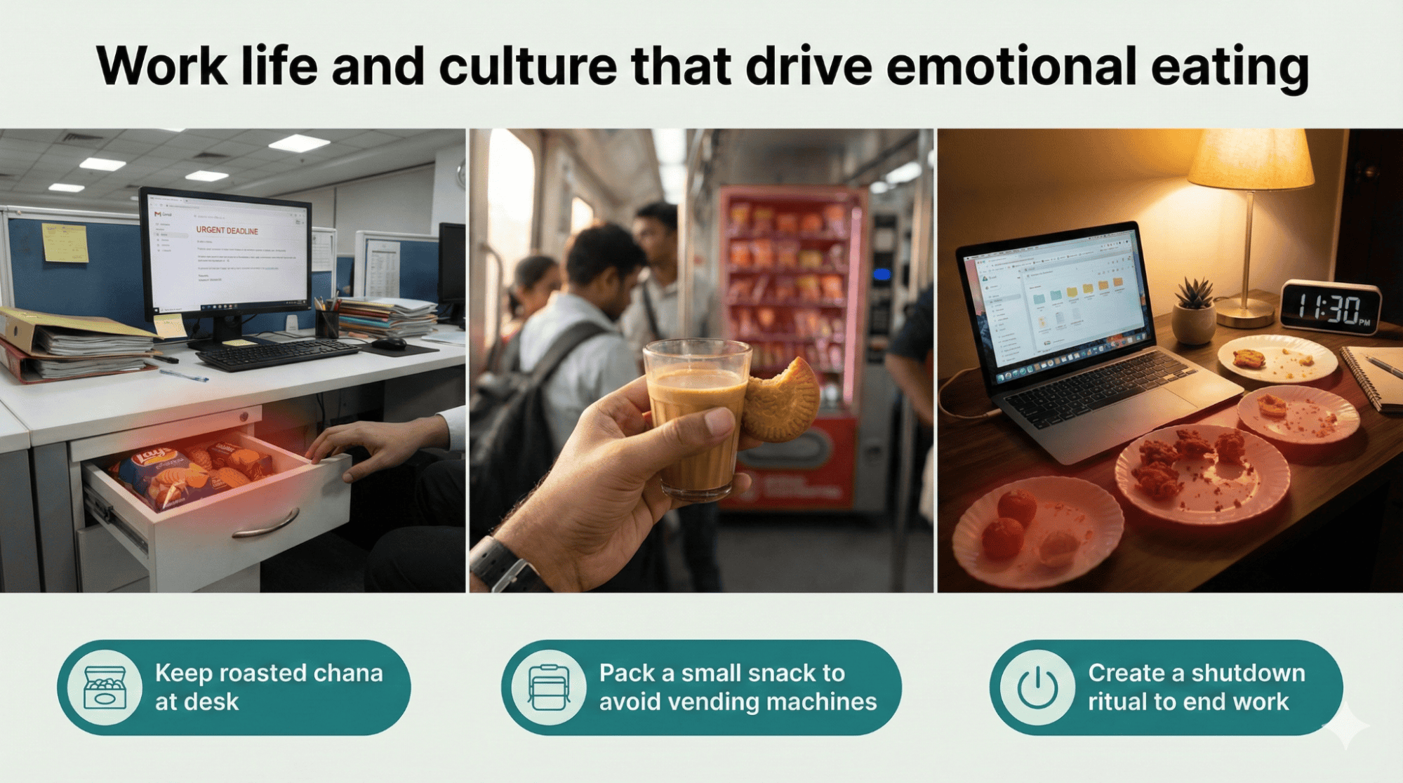 Office stress combined with easy access to vending machines filled with chips and biscuits creates perfect conditions for stress eating throughout workdays. Family expectations to finish everything on your plate regardless of hunger makes it harder to recognize actual fullness cues naturally. Late-night eating during stressful project deadlines becomes habitual, training your brain to associate work stress with food rewards consistently over time. Building awareness through journaling what you eat and why helps identify emotional triggers that drive your stress eating patterns specifically.