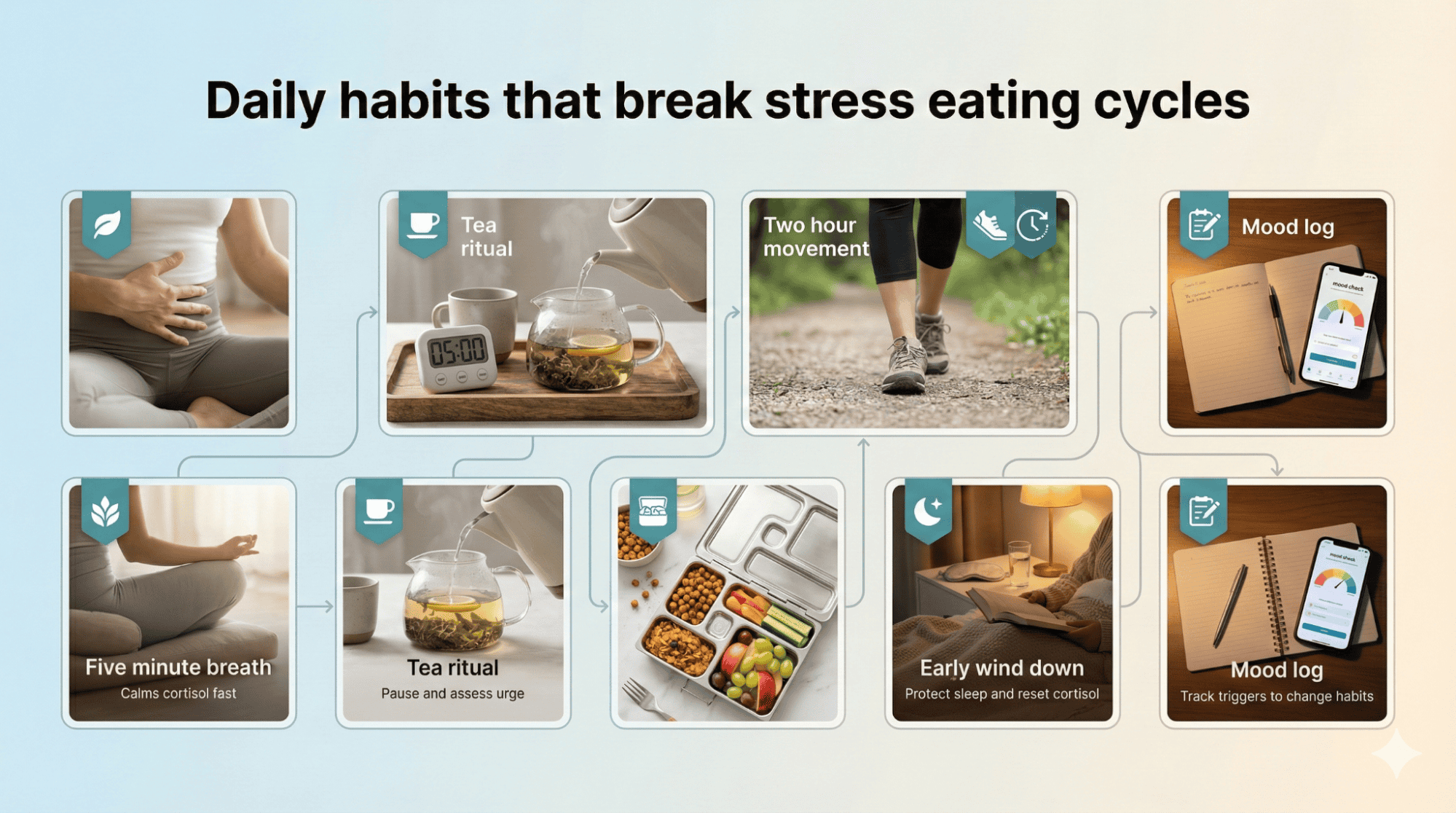 Start by keeping a stress and eating journal today to identify your specific triggers and patterns over the next seven days consistently. Practice one mindful eating technique such as eating without phone distractions at dinner tonight, building awareness of hunger cues versus emotional needs. Try deep breathing for five minutes when stress hits before deciding whether to eat, giving yourself space to choose a response rather than reacting automatically.