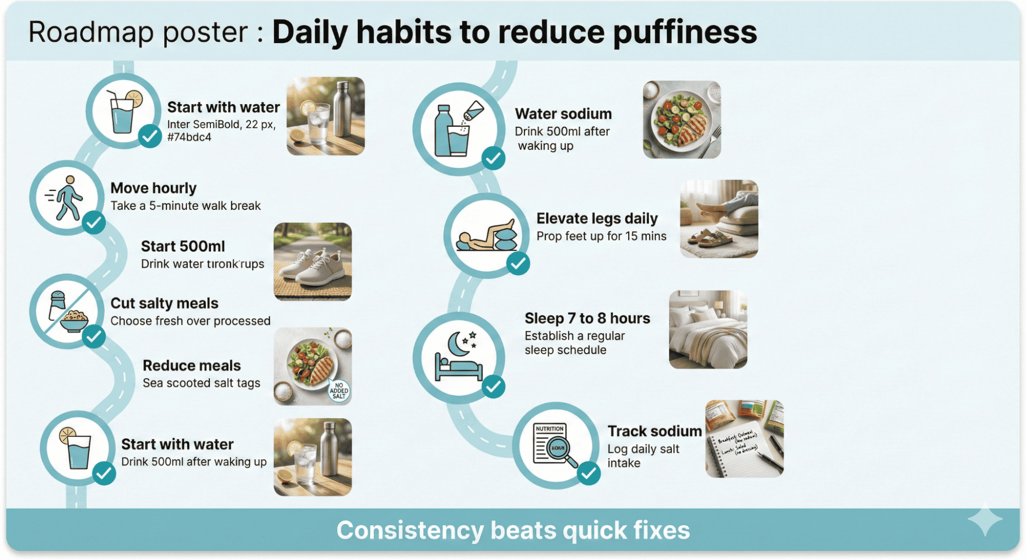 Start today with one simple change: measure the salt you use when cooking for the next week to build awareness. Drink a glass of water upon waking and before each meal. Additionally, take a 5-minute walk after lunch and dinner to improve circulation. These small actions create dramatic improvements in how you feel without extreme restriction.