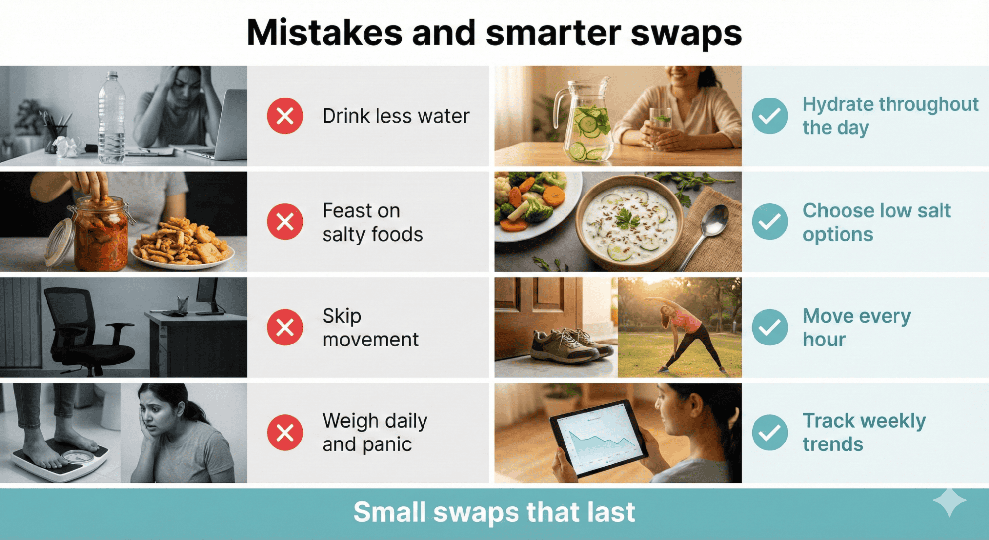 Many Indians sabotage water weight management through lifestyle habits they don’t connect to the issue. Sitting or standing for hours without movement causes significant lower body edema that people blame on diet when it’s actually poor circulation. Additionally, wearing tight clothes and shoes restricts circulation, worsening bloating. Not managing stress means constantly elevated cortisol promoting fluid retention. Moreover, weighing yourself multiple times daily and panicking at normal fluctuations creates anxiety that increases cortisol further. Comparing your weight to others ignores that everyone’s water weight patterns are different. Taking diuretic pills or laxatives without medical supervision is dangerous and creates dependency. These shortcuts damage your body’s natural fluid regulation. In fact, the cycle of extreme restriction followed by rebound retention is harder to break than simply managing sodium and hydration consistently from the start.